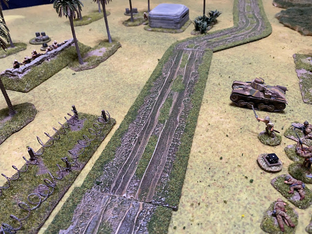 Given the cover available to the defenders I'm not certain a mortar barrage will help and so I consider using armour. At some point I'm going to have to get into the defensive position and armour might just help break through wire and overrun infantry positions. The British platoon has an anti-tank rifle and while they could call on a 2 pounder AT gun I suspect they will have other priorities. So I decide to call on two Ha Go tanks. They might give me an edge.