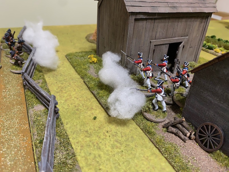 This was the moment I feared - to reach the fence the Continentals have had to move to within close range of the line of regulars. The redcoats will first fire a controlled volley at close range. The chance of inflicting damage on the Continentals is high.