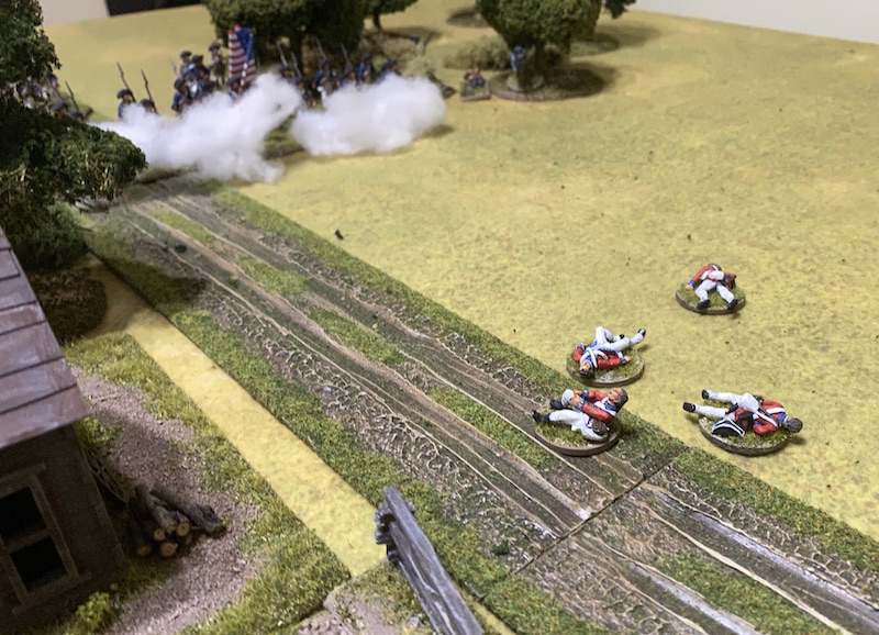 Lieutenant Smith's skirmishers are lining the edge of the woods with their muskets trained on the British, these are the sort of conditions favoured by irregular skirmishers and they open fire at long range from cover.