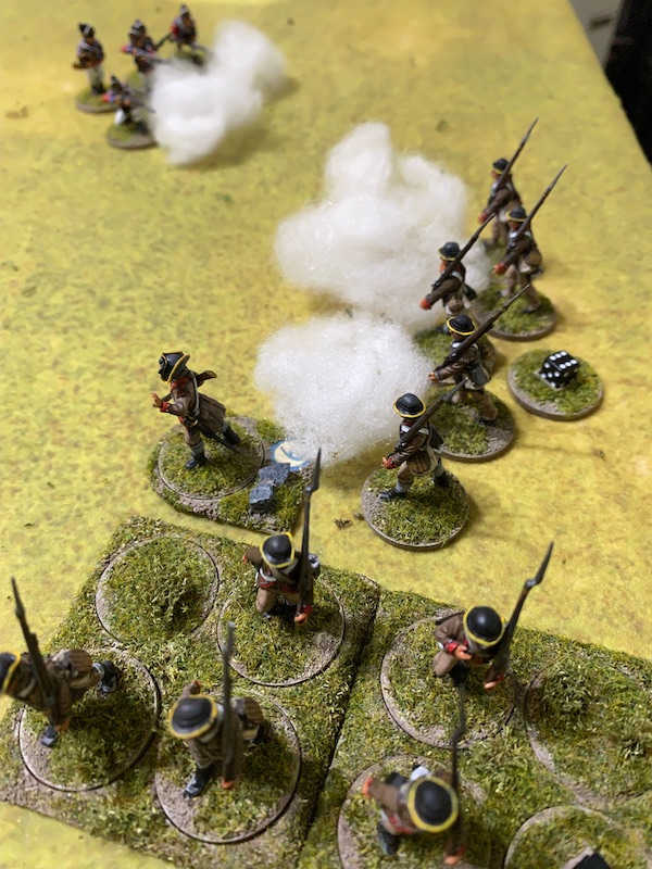 The rebels lose another man and suffer a further point of shock. The regulars then reload. British musketry is already taking its toll, putting Captain Horton in a tight spot.