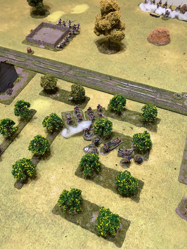The skirmishers are thrown back 18" out of the orchard and suffer more shock. Their leader is one of those taken casualty and he is knocked unconscious.