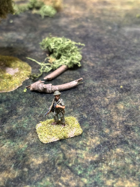 Given how difficult it is for infantry fire to inflict casualties or shock on a Japanese fortification it seems that engaging in a firefight with one seems like a fool's errand. During this game the fire on my section in the centre from the bunkers and spider holes was at effective range. Had the Japanese been under covering fire their chance of a hit would have gone from 1 in 3 to 1 in 6. That's a substantial difference. Both the infantry sections and the tank bow or coaxial machine guns can perform this suppressive role and I think it's key to finding a solution.