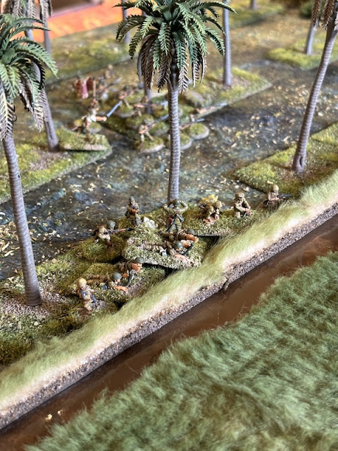 Well, more fool me. The Japanese had a ruse and used local guides to advance their left flank jump-off-point into the plantation where I had originally intended to put the mines or wire. Perhaps I should always trust my instinct! (In hindsight we may have played this incorrectly. I think a correct reading of the rules might put the order as follows - normal jump-off-points are placed at the end of the patrol phase, once that is done the Japanese announce the ruse and move their jump-off-point. Now that all jump-off-points are in position and the game is about to begin then defensive supports like minefields, roadblocks and barbed wire are placed. That said, I could see a case for playing it as we did as the ruse represents an unexpected development).