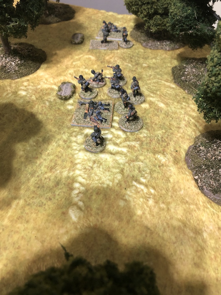 With force morale at two the Germans must move a unit to a jump-off-point. The squad at the corner of the woods is the most vulnerable and so it makes sense to pull them back from the firing line.