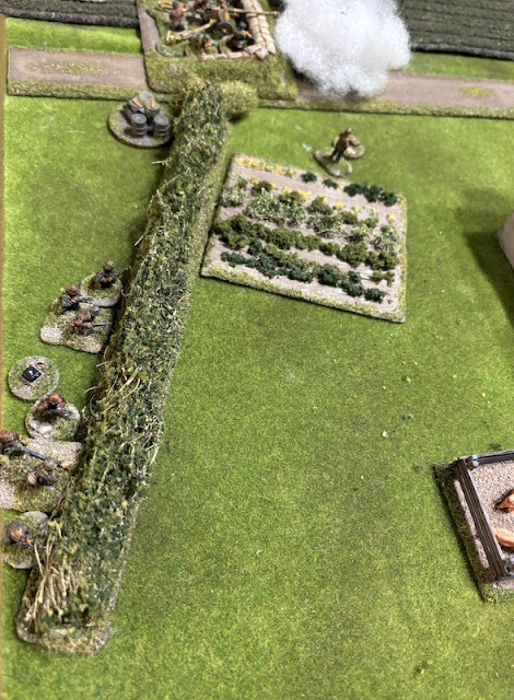 One of the LMG teams of the squad at the rear hedgerow are less fortunate but they suffer only one point of shock.